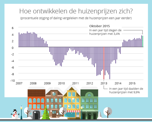Het gaat goed op de huizenmarkt! Koophuizen zijn in trek. In één jaar tijd is de huizenprijs met 3,5 procent gestegen: de grootste stijging sinds het begin van de crisis. De gemiddelde koopsom, officieel net iets anders dan de huizenprijs, steeg van € 224.800 naar € 237.800. Het einde van de prijsstijging is bovendien nog niet in zicht. Goed nieuws voor verkopers. Aandachtspunt voor kopers.