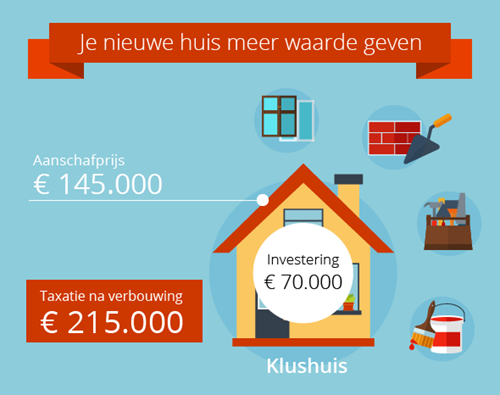 Aan een huis met een lage koopprijs kun je zelf waarde toevoegen via de verbouwing. Je kunt in dat geval een hypotheek krijgen zonder dat je daar zelf veel geld voor hoeft mee te nemen. Omdat je zelf klust, investeer je vooral tijd en relatief maar een beetje geld voor materialen. Daarom heb je voor een klushuis niet zoveel eigen geld nodig.