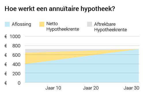 Bij een annuïteitenhypotheek betaal je iedere maand een vast bedrag aan hypotheekrente en aflossing. Dit heet de annuïteit. In het begin bestaat dit bedrag voor een relatief groot deel uit rente. Door de maandelijkse aflossing wordt jouw hypotheekschuld langzaam lager. Naar mate de jaren verstrijken betaal je dus steeds iets minder hypotheekrente over je hypotheek. Dat geeft ruimte om iedere maand weer een wat hoger bedrag af te lossen. Na dertig jaar is je hypotheek volledig afgelost.