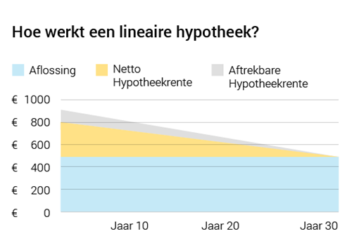 Bij een lineaire hypotheek betaal je iedere maand een vast bedrag aan aflossing. Over de resterende hypotheekschuld betaal je hypotheekrente. Je schuld wordt steeds lager, en dus betaal je ook iedere maand iets minder hypotheekrente. Bij een lineaire hypotheek is de eerste maand dus het duurst, en de laatste maand het goedkoopst. Na dertig jaar is je hypotheek volledig afgelost.