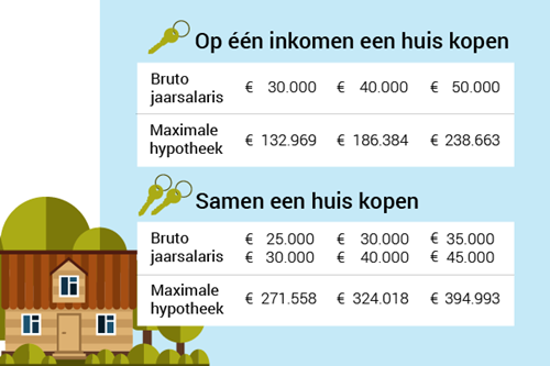 Je maximale hypotheek is grotendeels afhankelijk van je inkomen. Koop je samen met een partner, dan kun je op basis van beide inkomens lenen. Wat voorbeelden: