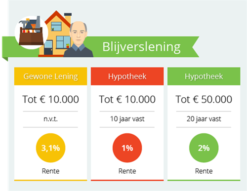 De blijverslening is op dit moment de hypotheek met de laagste rente. Voor leensommen tot 10.000 euro bedraagt die 1 procent. Tussen de 10.000 en 50.000 euro is de rente 2 procent. Je kunt de blijverslening ook krijgen zonder een huis als onderpand. Dan is het een consumptief krediet. De rente bedraagt in dat geval nog steeds slechts 3,1 procent.