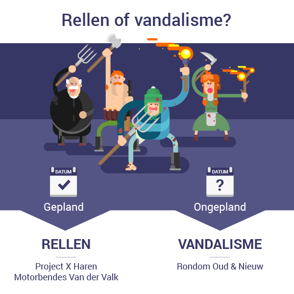 Bijvoorbeeld de autoverzekering maakt onderscheid tussen rellen en vandalisme. Project X maar ook de schade bij Van der Valk Rotterdam valt onder ‘rellen’. Schades door vernielingen bij Oud en Nieuw vallen onder vandalisme.