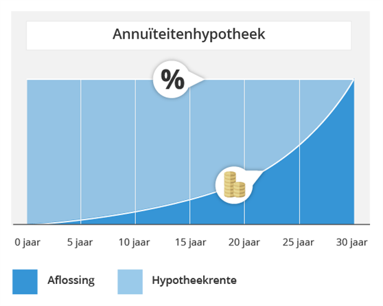 Bij de annuïteitenhypotheek zijn de bruto rente plus de aflossing samen elke maand één vast bedrag. Dat bedrag noemen we ‘de annuïteit’. Je betaalt iedere maand dus hetzelfde aan je hypotheek. Dertig jaar lang. Aan het einde van de looptijd heb je het volledige hypotheekbedrag afgelost.