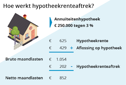 Iedereen met een eigen woning betaalt in de eerste plaats belasting voor het eigenaarschap. Dat is het eigenwoningforfait. Dit bereken je door een percentage van de WOZ-waarde bij je inkomen op te tellen. Voor woningwaardes tussen € 75.000 en € 1.050.000 is dat 0,75%.