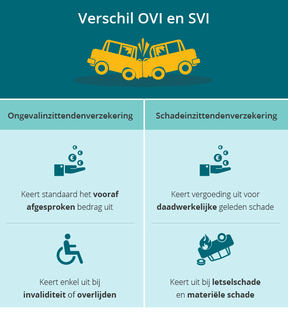 Met de schadeverzekering voor inzittenden (SVI) en ongevallen inzittendenverzekering (OVI) verzeker je je voor de schade van medepassagier(s) na een ongeluk. De verzekeringen zijn vooral relevant als je zelf de veroorzaker bent van een ongeval of als er geen schuldige aan te wijzen valt. Ook jouw schade is verzekerd. De dekking en het uit te keren bedrag verschilt.