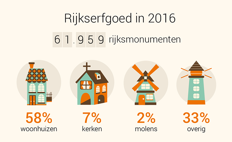 Ons land staat vol met monumenten: rijksmonumenten, gemeentelijke monumenten en in Drenthe en Noord-Holland ook provinciale monumenten. Dat kan van alles zijn: een kerk, herenhuis, vrijstaande woning, oude ambtswoning, boerderij, molen of watertoren.