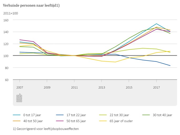 Vooral de groep van 17 tot 22 jaar laat het afweten. Niet alleen de krapte op de woningmarkt is daar debet aan. De in 2015 gewijzigde studiefinanciering helpt ook niet mee. Naast jongeren blijven ook mensen boven de 65 jaar achter ten opzichte van het gemiddelde. Bij gebrek aan mogelijkheden is de verwachting dat deze groep eerder kiest om met aanpassingen langer in de huidige woning te kunnen blijven.
