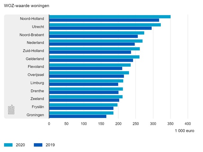 De stijgingspercentages van de gemiddelde woningwaarde waren het hoogst in de provincies Groningen en Flevoland. In Groningen steeg de gemiddelde woningwaarde met 12 procent naar €186.000. Daarmee is de gemiddelde WOZ-waarde in Groningen nog wel het laagst van alle provincies. In Flevoland steeg de gemiddelde waarde met ruim 11 procent naar €236.000 per woning. In Zeeland was de toename van de gemiddelde woningwaarde, met bijna 5 procent, het laagst.