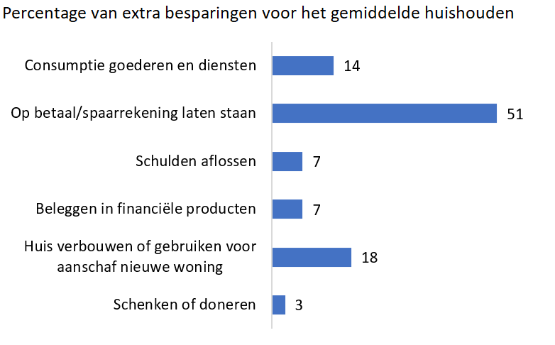 Huishoudens hebben onder invloed van de coronamaatregelen extra gespaard. Dit geld blijft vooral op de spaarrekening staan. Slechts 14 procent is van plan het uit te geven aan spullen of diensten. Het verbouwen van de woning of kopen van een nieuwe is het populairste bestedingsdoel.