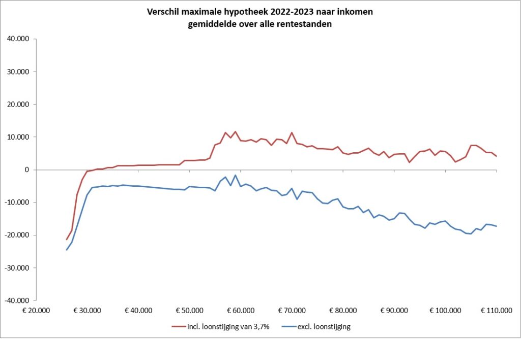 Er zijn nog twee kanttekeningen te plaatsen bij de verruimde leennormen. Het Centraal Planbureau verwacht dat de lonen in 2023 met 3,7% stijgen. Uit de stresstest blijk dat kopers fors minder kunnen lenen als die stijging niet voor hen geldt (zie bovenstaande afbeelding). Daarnaast heeft het Nibud rekening gehouden met een gelijkblijvende rente. Stijgt de rente verder in de toekomst, dan daalt het maximum bedrag dat je kunt lenen alsnog.