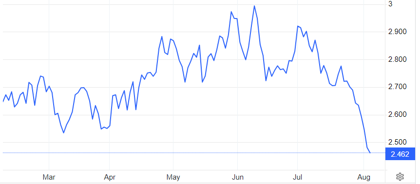 Sinds begin juni is de richting van de staatsobligaties al dalend, met een versnelling in juli. Dit is een trendbreuk, aangezien de rente sinds maart juist in een opwaartse trend zat. Aan de grafiek van de afgelopen 6 maanden valt ook te zien dat de recente daling relatief fors is. Van bijna 3 procent naar minder dan 2,5 procent in nog geen twee maanden. Voor de komende weken is afwachten in hoeverre de daling aanhoudt.